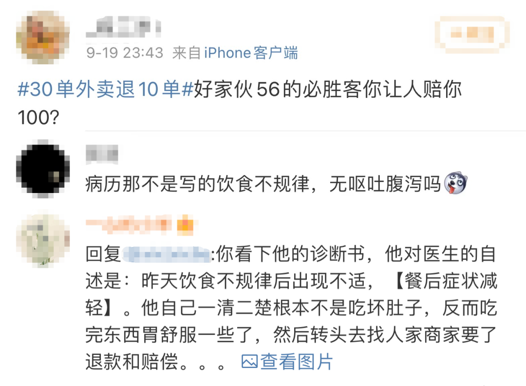 还有眼尖的网友指出,小林根本就是在恶意索赔。那单号称“吃了肚子不舒服”的必胜客,实付56元,他找商家索赔100元;病历仔细一看,写的是“饮食不规律,无呕吐腹泻”,看不出与商家有直接关系。