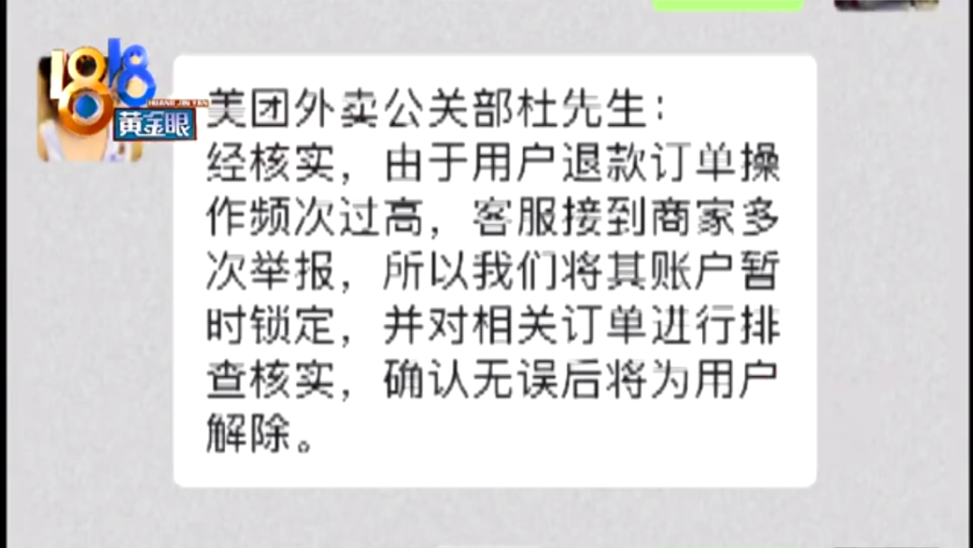 后来美团方面回复,“经核实,该用户退款订单操作频次过高,客服接到商家多次举报,所以平台对该账户暂时锁定,并对相关订单进行排查核实,确认无误后将会解除限制。”