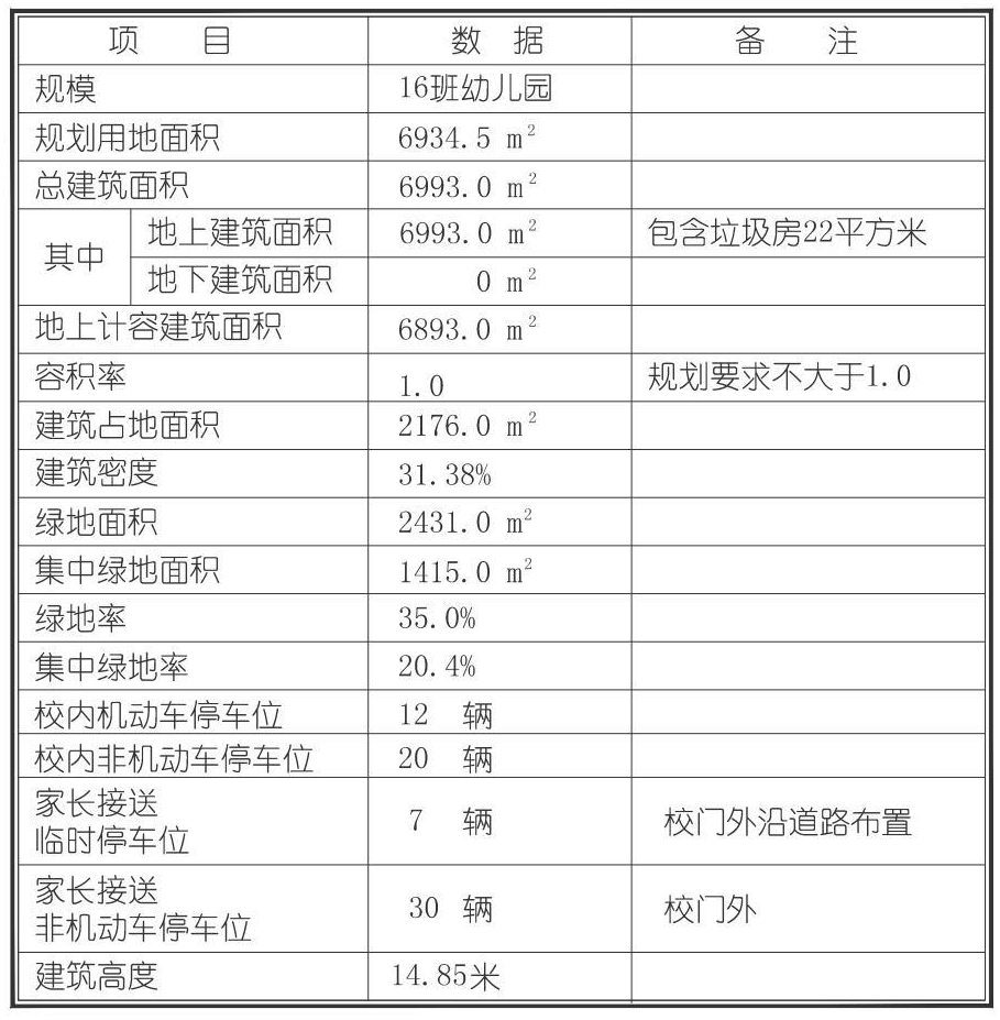 设计总建筑面积6993平方米,无地下建筑物。项目规模为16班幼儿园,拟建内容包括2个建筑单体:教学综合楼、门卫。教学综合楼地上4层建筑高度14.85米;门卫用房为单层建筑,建筑高度4.2米。