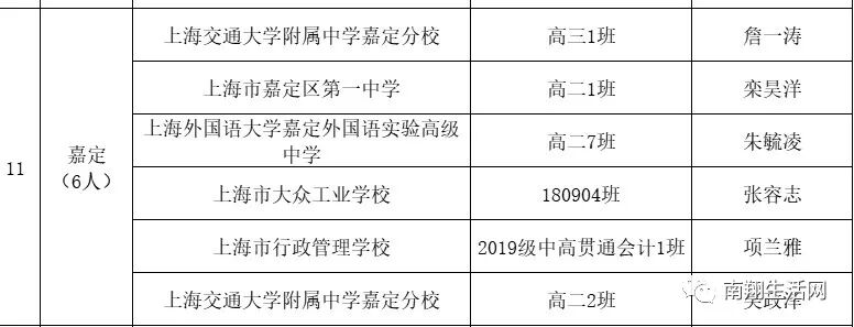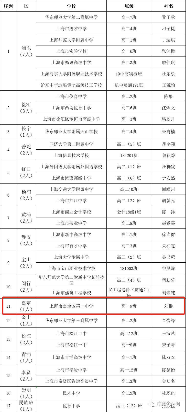 2020-2021学年上海市中等学校(高中、中等职业学校)优秀学生干部名单(共34人,嘉定有1人)