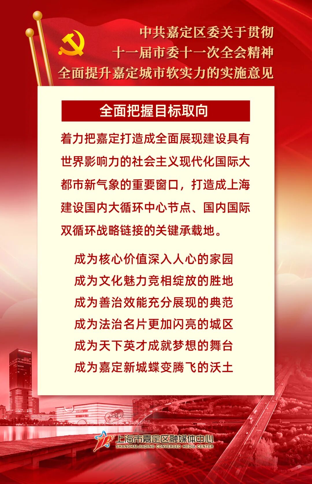 全会强调,要准确把握城市软实力的基本内涵和特点,为全面提升城市能级和核心竞争力厚植实力之基。软实力看似无形,但确是客观存在;需要长期积淀、必须久久为功;具有鲜明的标识性,需要着力凸显。《实施意见》立足嘉定城市发展定位和发展阶段,明确了“六个成为”的目标取向:即成为核心价值深入人心的家园,成为文化魅力竞相绽放的胜地,成为善治效能充分展现的典范,成为法治名片更加闪亮的城区,成为天下英才成就梦想的舞台,成为嘉定新城蝶变腾飞的沃土。提出了“六个全力”的主要任务,即全力弘扬社会主义核心价值观,全力推动文化魅力竞相绽放,全力推动社会治理赋能增效,全力推动创新创业成就梦想,全力推动嘉定新城蝶变腾飞,全力推动城市品牌形象提升。要全面对标对表、狠抓落实落地,不断提高城市的凝聚力、吸引力、创造力、影响力。