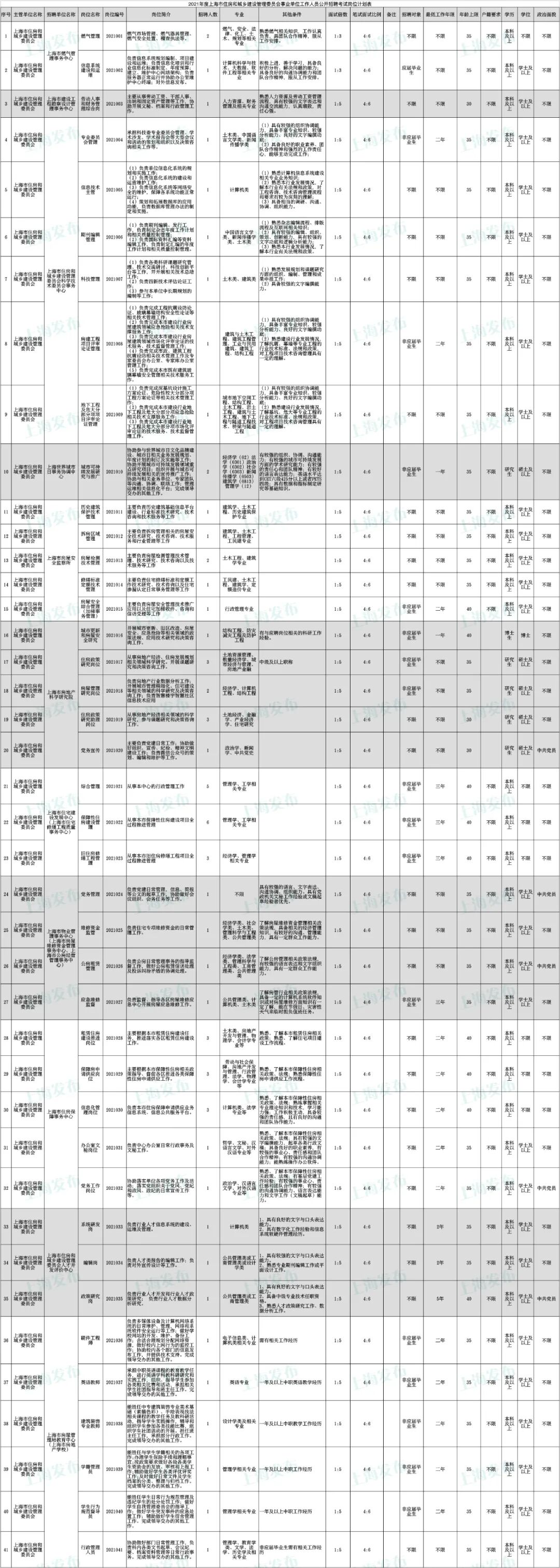 1、上海市燃气管理事务中心  2、上海市建设工程勘察设计管理事务中心   3、上海市住房和城乡建设管理委员会科学技术委员会事务中心   4、上海世界城市日事务协调中心   5、上海市房屋安全监察所(上海市历史建筑保护事务中心、上海市住宅修缮工程质量检测中心)   6、上海市房地产科学研究院   7、上海市住宅建设发展中心(上海市住宅修缮工程质量事务中心)   8、上海市物业管理事务中心(上海市房屋维修资金管理事务中心、上海市公房经营管理事务中心)   9、上海市住房保障事务中心   10、上海市住房和城乡建设管理委员会人才开发评价中心   11、上海市房屋管理局教育中心(上海市房地产学校)   以上11家单位共招聘66名事业单位工作人员。