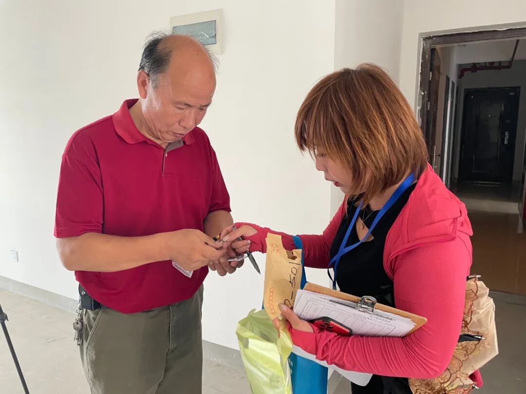 吴小一一家是今天来办理交房手续的第一户村民,核对过房源资料、交纳差额房款和维修基金、获得《进户流转单》后,在物业工作人员的陪同下,全家人前往新房验收。