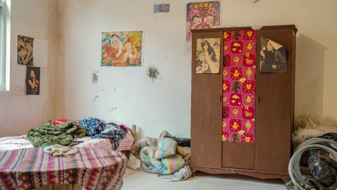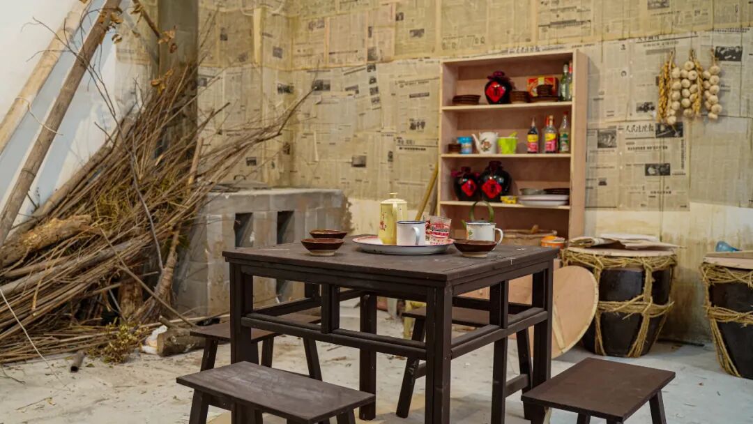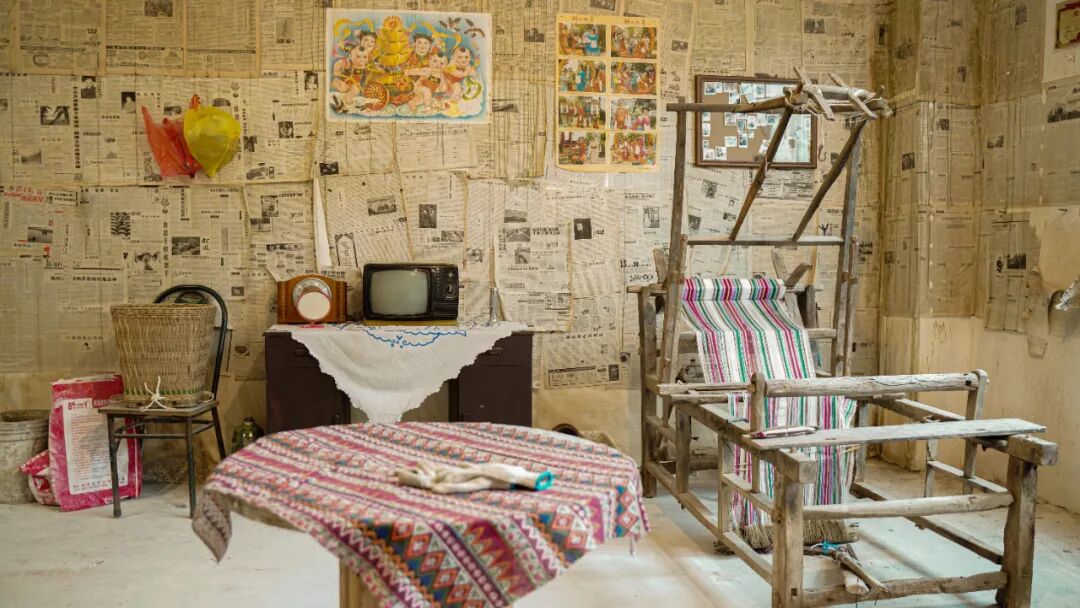 脸盆架上放着印有红色囍字的陶瓷脸盆,整面石墙贴满旧报纸,床上摆放着军大衣和枕巾,灶头边堆满柴禾,炊烟袅袅升腾,这间农村房生动地还原了上世纪八九十年代的生活情境。