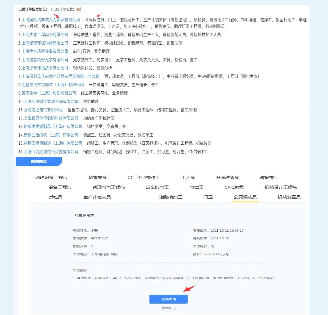 (二)进入嘉定伯乐人才网首页“2021年10月15日-10月20日嘉定人才市场网络招聘会”专题通道,点击蓝字单位名称处进入招聘单位进行招聘岗位报名。