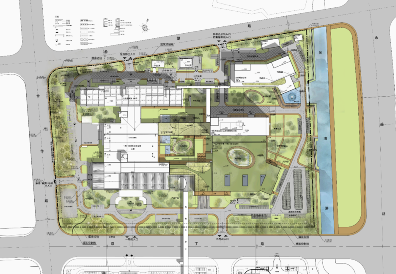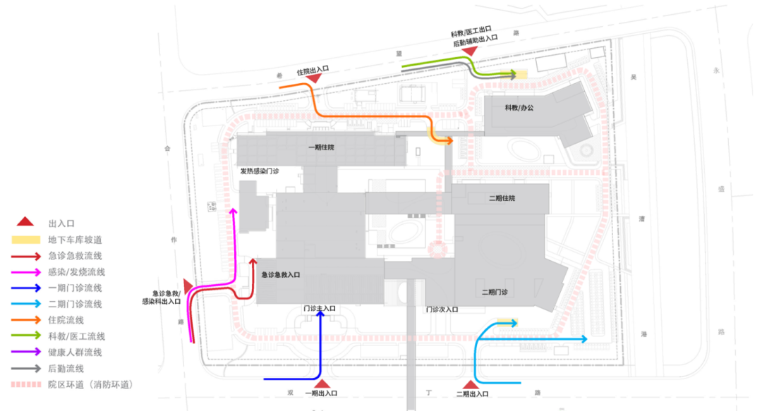 院区整体规划流线设计根据各类人群的特点,于场地周边分别设置出入口,最大程度避免流线交叉。同时将地下车库出入口紧靠场地外围布置,实现院区内的人车分流。