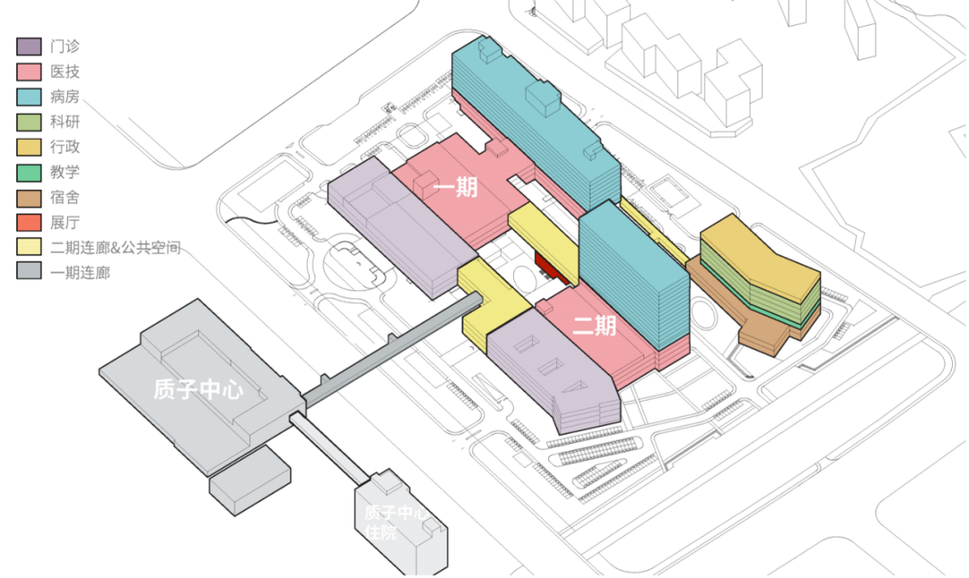 一、二期建筑将通过空中连廊相连,在功能流线上形成有机整体。在功能设置上按中心化、模块化进行考虑,采用集中和分散相结合的平面布局方式。住院楼位于医技楼上部,通过竖向交通和医技各个部门紧密连接。门诊区位于地块南侧,通过医疗街和医技楼相连接,并与一期形成紧密的联系。下沉式广场同时连接一期和二期,巨大的室外步行空间给门诊医技人流提供了天然的休息场所与商业空间。科教综合楼位于基地东北角,紧贴吴漕港,尽享景观优势,并通过连廊与一期、二期医技裙房紧密相连。