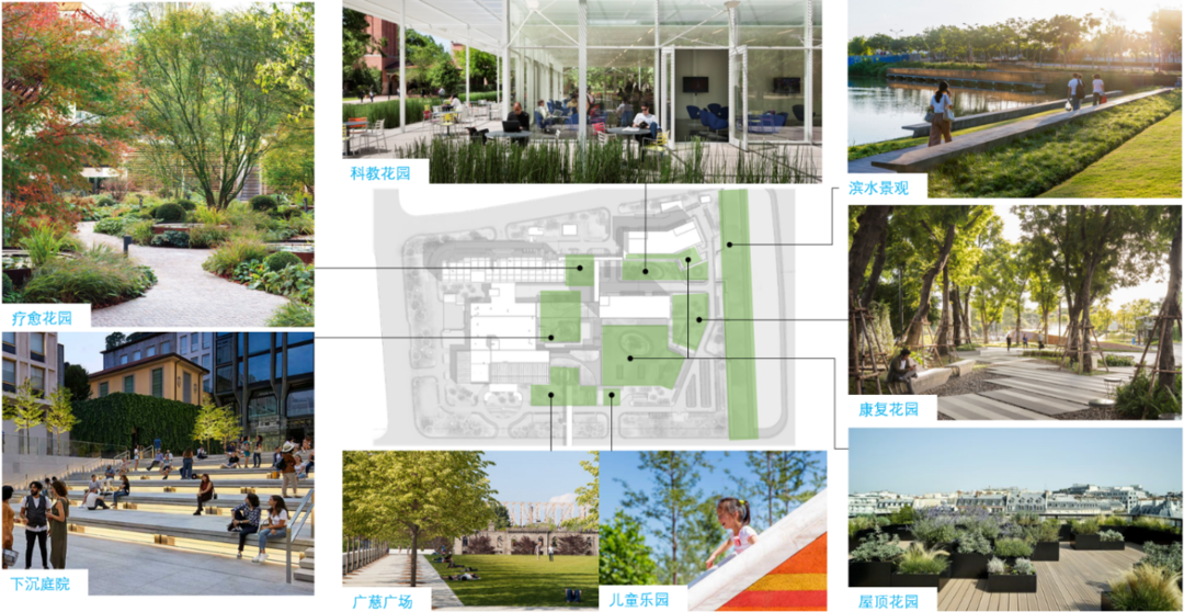 作为广慈医学建筑风格及“广袤森林、静谧小溪”愿景的传承及延伸,瑞金医院北部院区二期扩建工程因地制宜引入东侧吴漕港水系,结合原有中心下沉式庭院、屋顶花园,构建灵动多维花园,为病患和医护人员创造了一个雅致、开放的休憩空间。