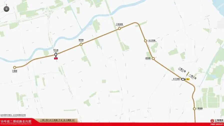 位于宝山区境内的18号线二期工程进入了土建施工阶段。线路起自一期长江南路站,至大康路站,全长约8.1公里,全部为地下线,设车站6座,包括通南路站、长江西路站、江杨南路站、爱辉路站、呼兰路站、大康路站,新建庙行停车场1座、江杨南路主变电所1座。