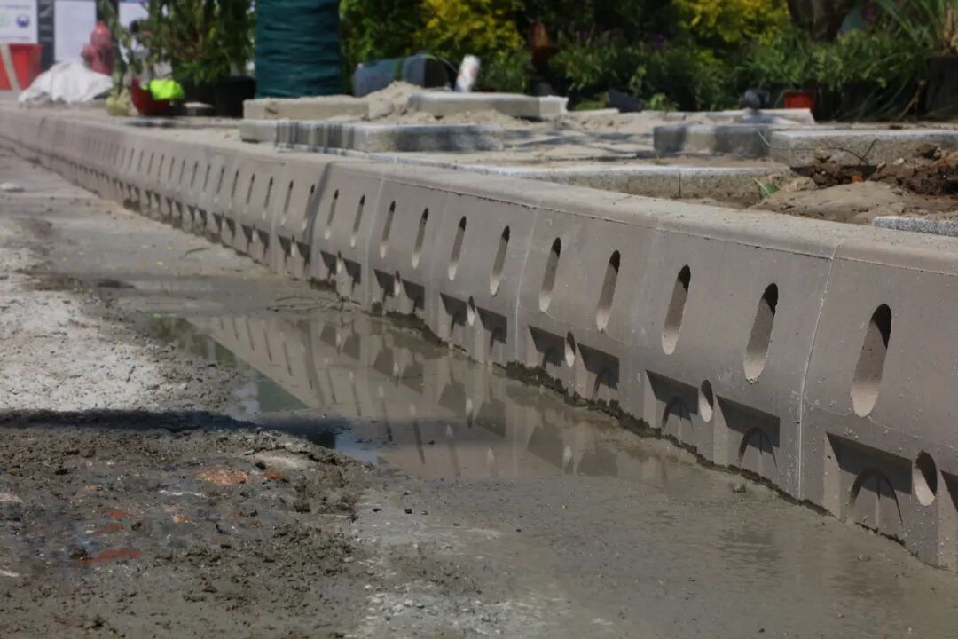 除了形象上的提升,作为嘉定打造海绵城市的样板路段,白银路样板段在施工中也使用了多种透水材料和新工艺,以此提升道路的蓄水排涝能力。“在非机动车道,我们采用透水沥青。道路一侧,整段都采用了多孔排水侧缘石,人行道的下部采用了透水混凝土,上部采用了花岗岩透水板。” 王玉龙表示,这样的设计在满足道路通行功能的同时,又满足了海绵城市排水的需求。