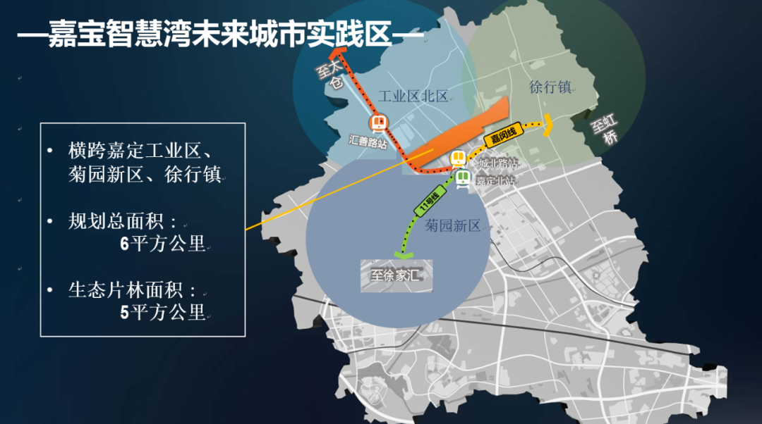 根据规划,嘉宝智慧湾未来城市实践区项目位于轨交11号线嘉定北站以及正在建设中的嘉闵线城北站附近,涉及嘉定工业区、菊园新区和徐行等三镇,规划范围东至嘉行公路、南至祁迁河昌徐路、西至G15沈海高速、北至绿意路,总面积6平方公里。项目将围绕“三生融合”,打造智慧生活的先行地、智能传感企业的集聚地、集成电路产业的引领地、数字化转型的示范地和生态宜居的向往地,五位一体的未来智慧城市,充分体现“人民城市”的理念。