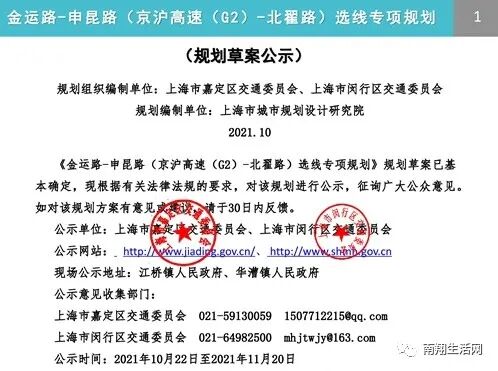 今日,南翔生活网从闵行区规资局获悉,《金运路-申昆路(京沪高速(G2)-北翟路)选线专项规划(规划草案公示)》正在公示。