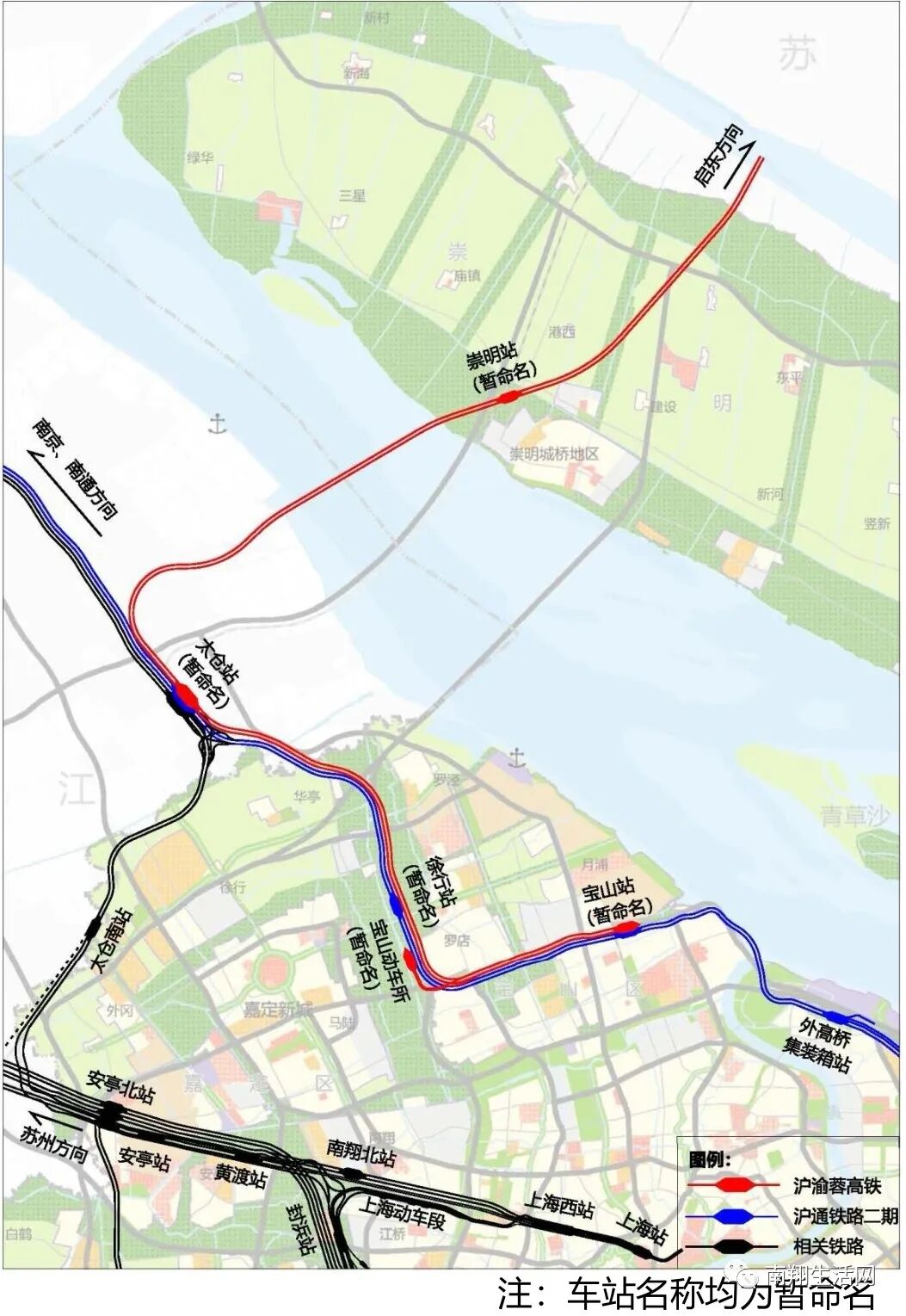 沪渝蓉高铁从江苏省启东市以高架形式向南跨越长江北支后进入上海市崇明区,在崇明区向西南方向走行,在城桥镇西北侧设崇明站后,以地下形式穿越长江南支进入江苏省太仓市。