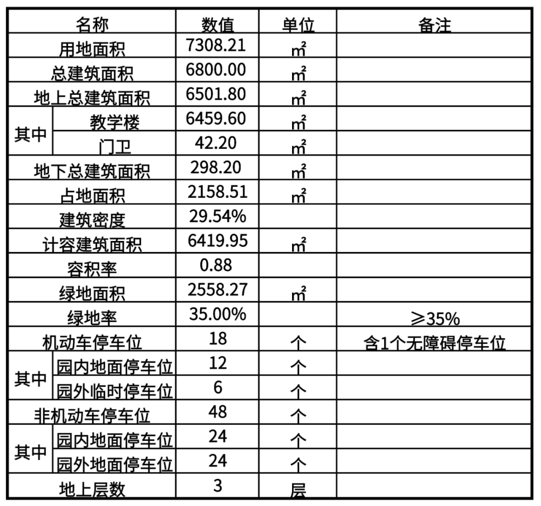 用地性质为基础教育设施用地,用地面积7308.21平方米,建筑限高15米。拟建总建筑面积6800.00平方米,其中地上建筑面积6501.80平方米,地下建筑面积298.20平方米。