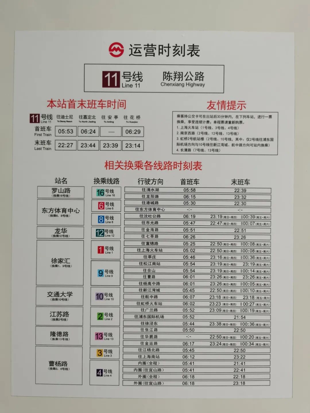 根据最新公布的时刻表,开通运营后的陈翔公路站,每天往迪士尼、嘉定北和花桥方向的首班车时间,分别是5:53、6:24和 6:29,末班车时间为22:27、23:44和23:14。其中,往安亭方向的末班车时间为23:39。
