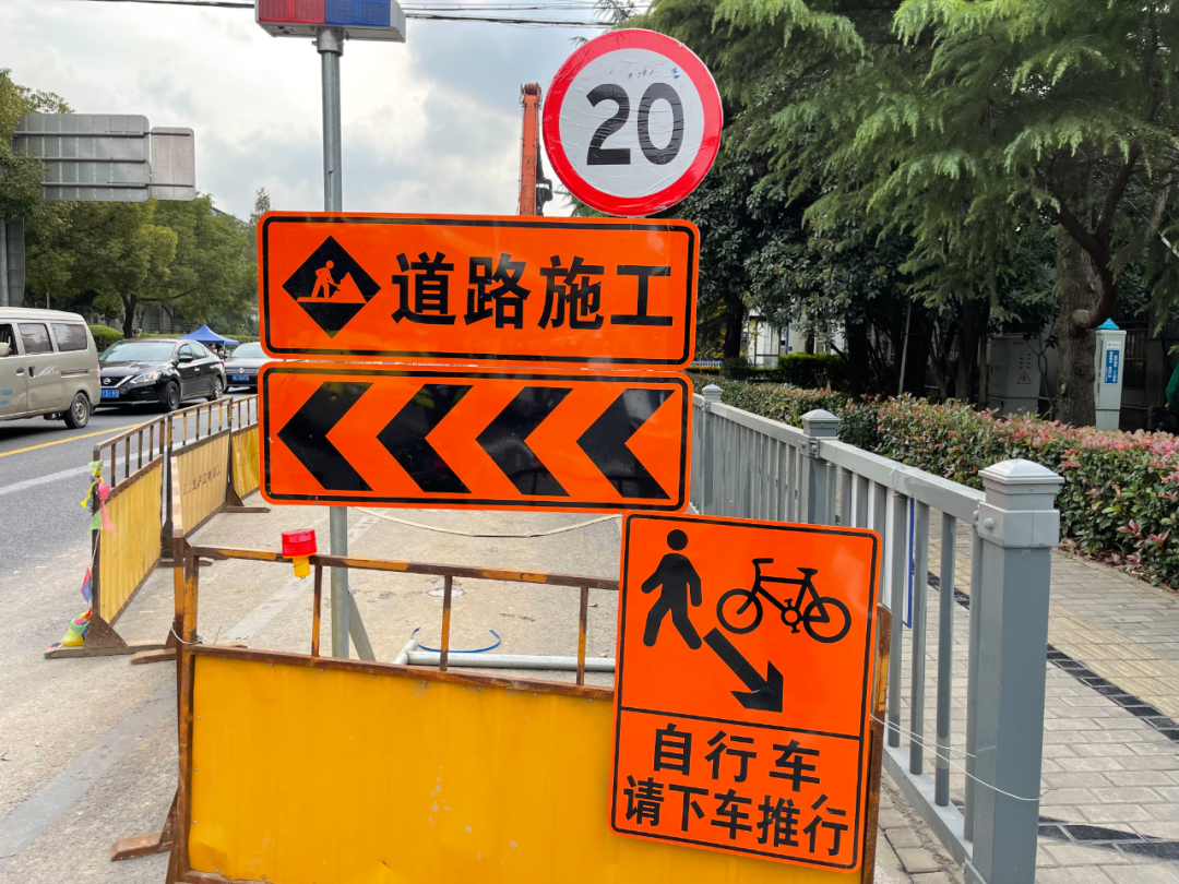 施工方在醒目位置设置地面地上标志,也安排了工作人员指引非机动车下车推行。