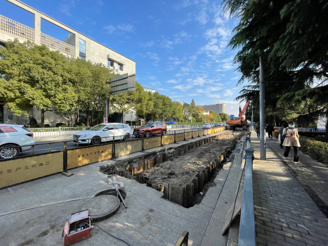 从现场可以看到,原先道路由北向南的方向上,路面已经开始凿开排管,非机动车需要借用边上的人行道。