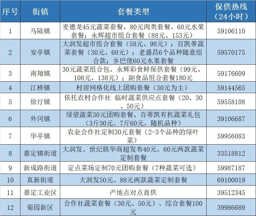 封控期间,我区每个街镇除了少量正常营业的超市菜场外,还开设了保供套餐(详见下表),送货进小区。居民朋友们可以通过社区群、公众号、保供电话等咨询。因人力有限,请尽量减少非必要采购需求,让志愿者“少跑腿”。