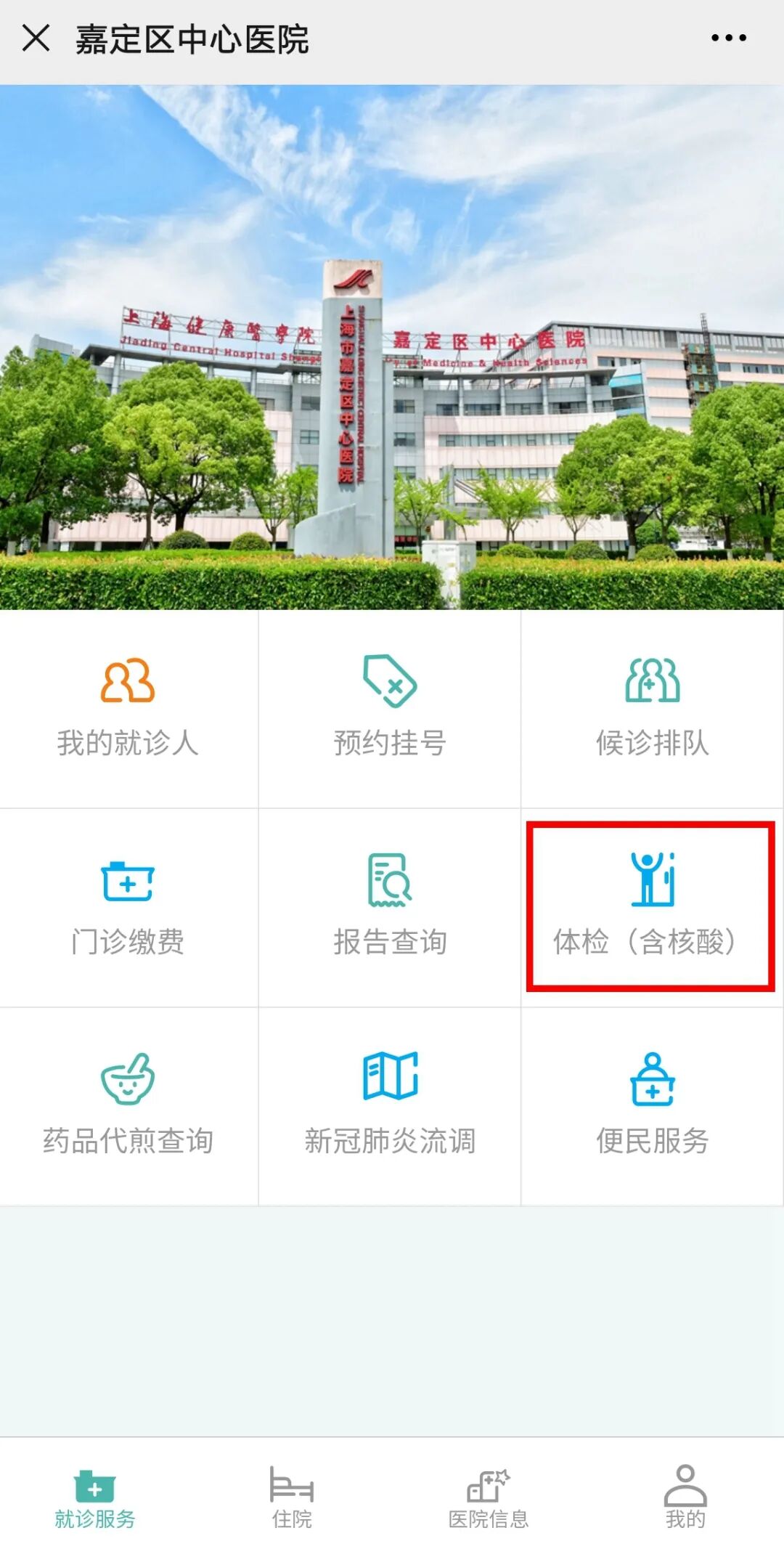 1、关注微信服务号“嘉定区中心医院”。