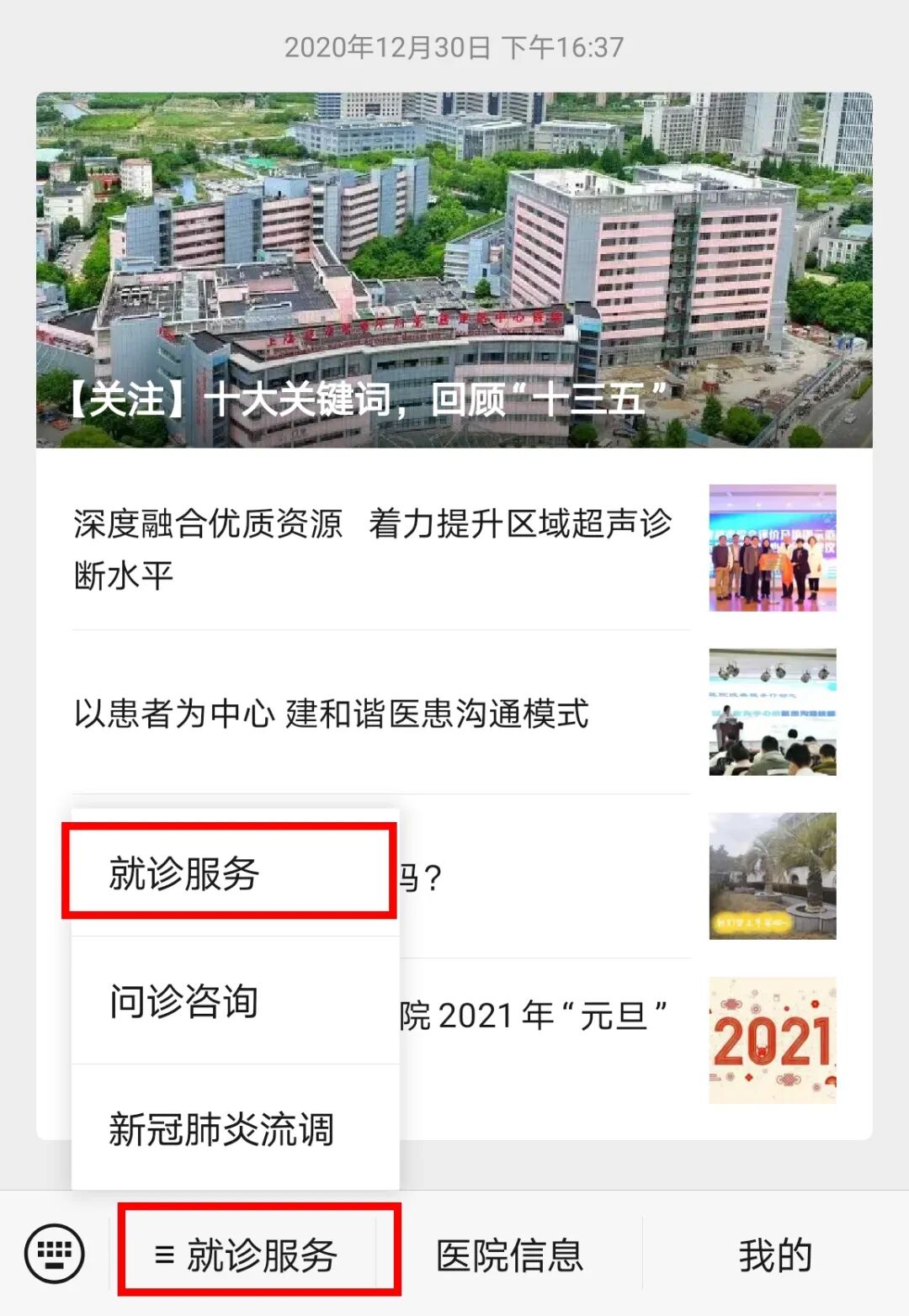 2、进入公众号,点击左下角“就诊服务”。