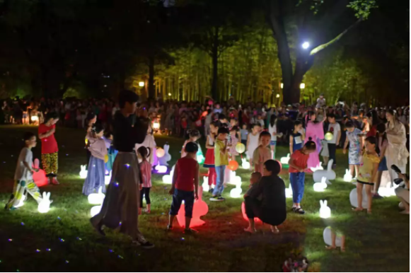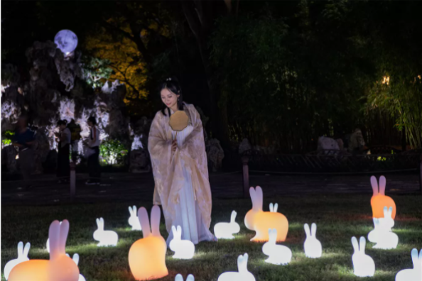 为了打造中秋的氛围,古猗园在园内营造了“月兔赏月”景观,将玉兔从广寒宫“请”下来,和游客一起共度人间中秋佳节。10月1日18:00-19:10,游客可在园内小草坪参加拜月仪式,传承千年传统习俗,表达人们祈求月神降福人间的良俗佳愿。