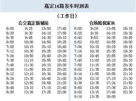 一、自2021年5月15日首班车起,嘉定14路调整为工作日节假日时刻表、临时绕改道。发车时刻表如下:
