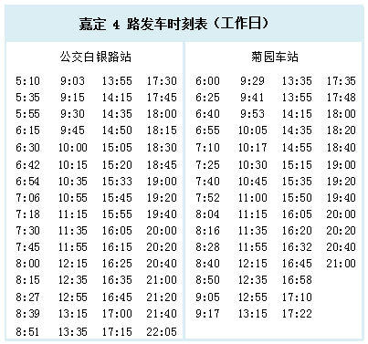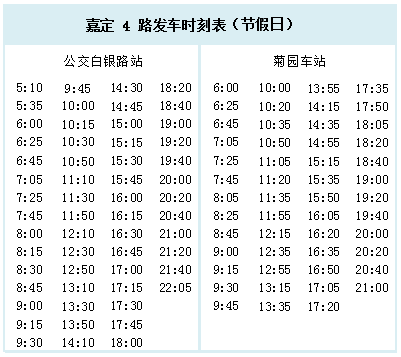 自2022年9月1日首班车起,嘉定4路调整行车时刻表,具体发车时刻表如下: