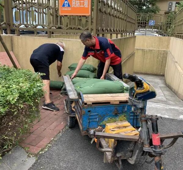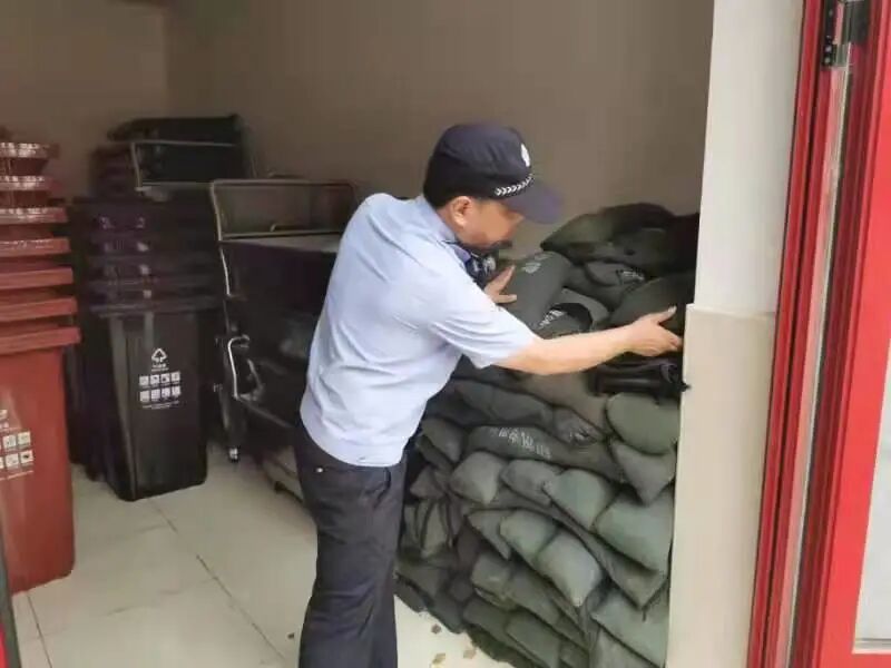 安高小区准备了100多个防水沙袋等临时防汛物资。     在白银社区旭辉华庭小区,物业工作人员在地下车库入口前堆放防汛沙袋,并对小区内的下水道和天沟进行疏通。