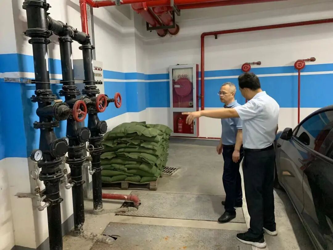 春海社区提前测试抽水泵运行、防汛物资配备情况,台风暴雨期间车辆禁止停入地下车库。