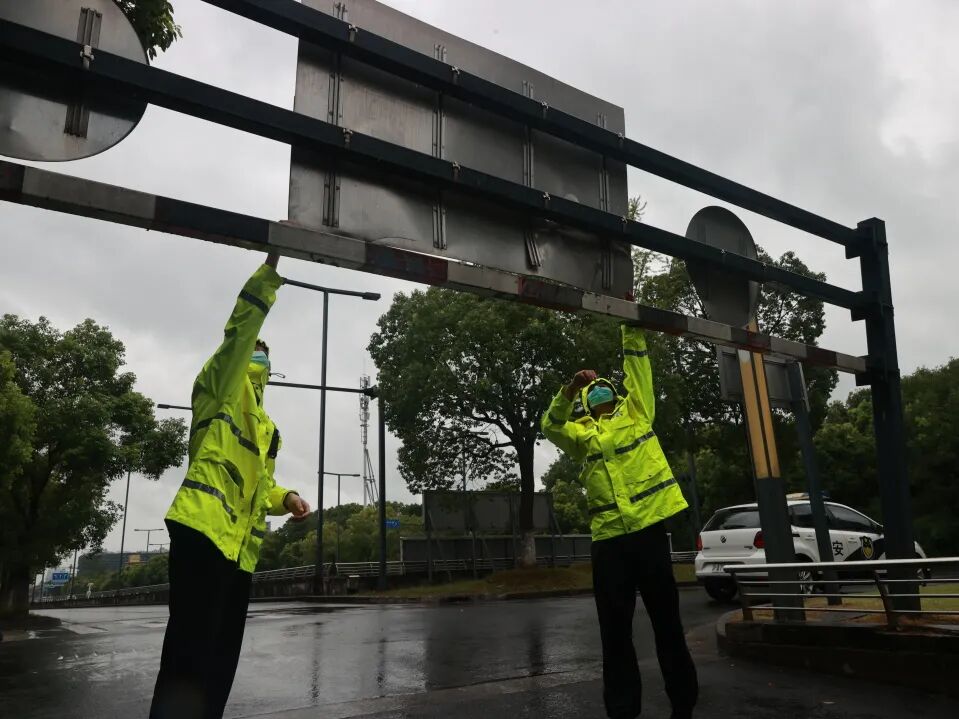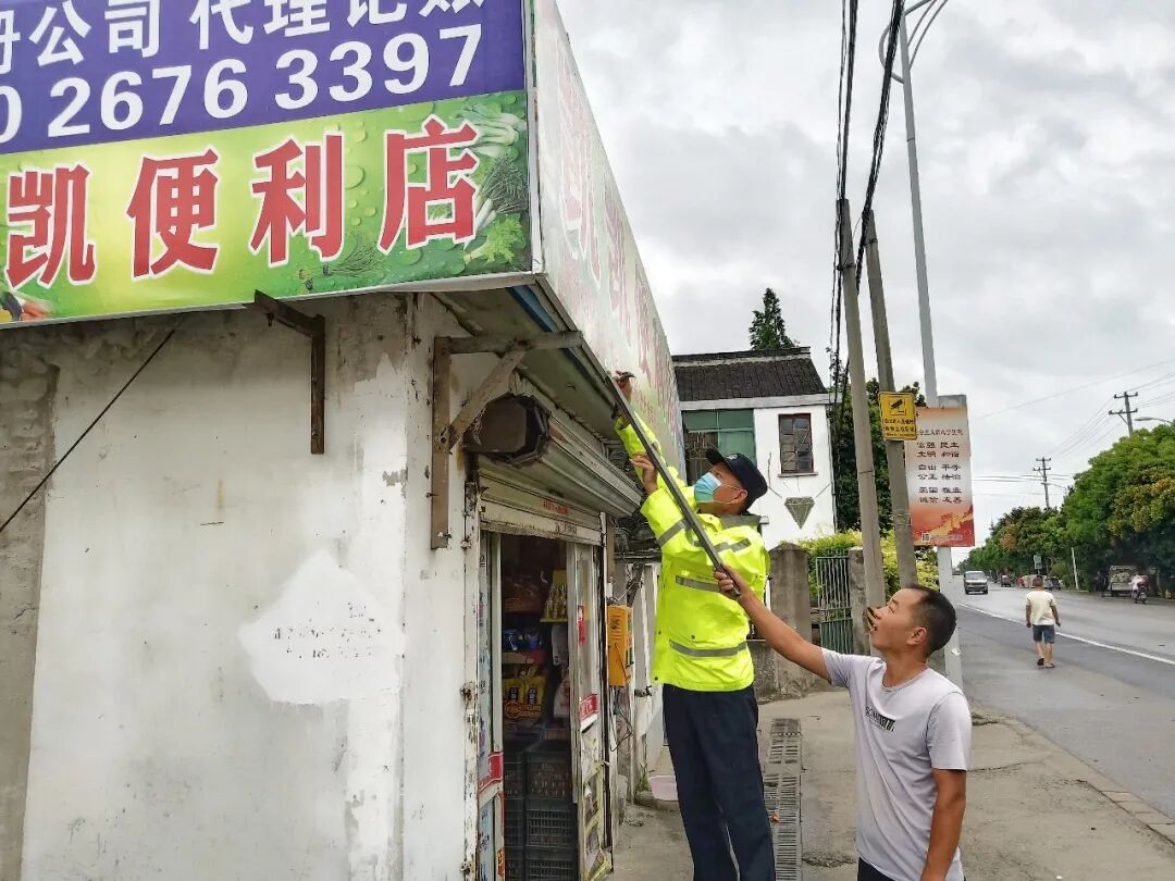 外冈镇城管中队对沿街商铺和建设工地开展防汛防台检查。对沿街商铺店招店牌、户外广告、景观照明设施等进行针对性检查和加固,避免强风暴雨导致坠落伤人。同时,要求作业人员落实安全措施,严格规范操作,避免发生安全事故。