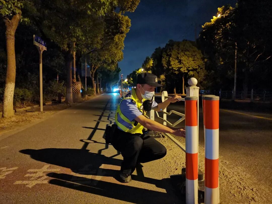 唐行所民警仔细检查辖区嘉行公路沿线交通隔离设施安装情况。