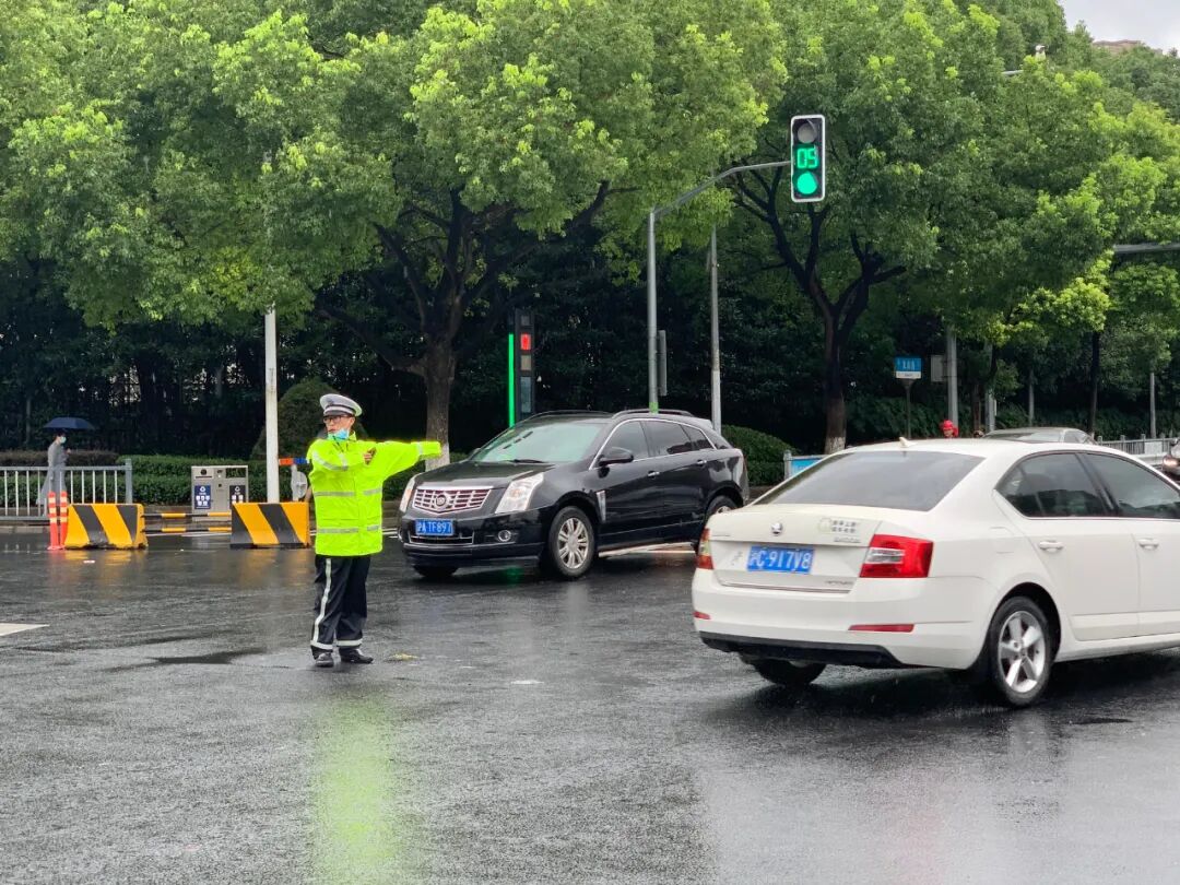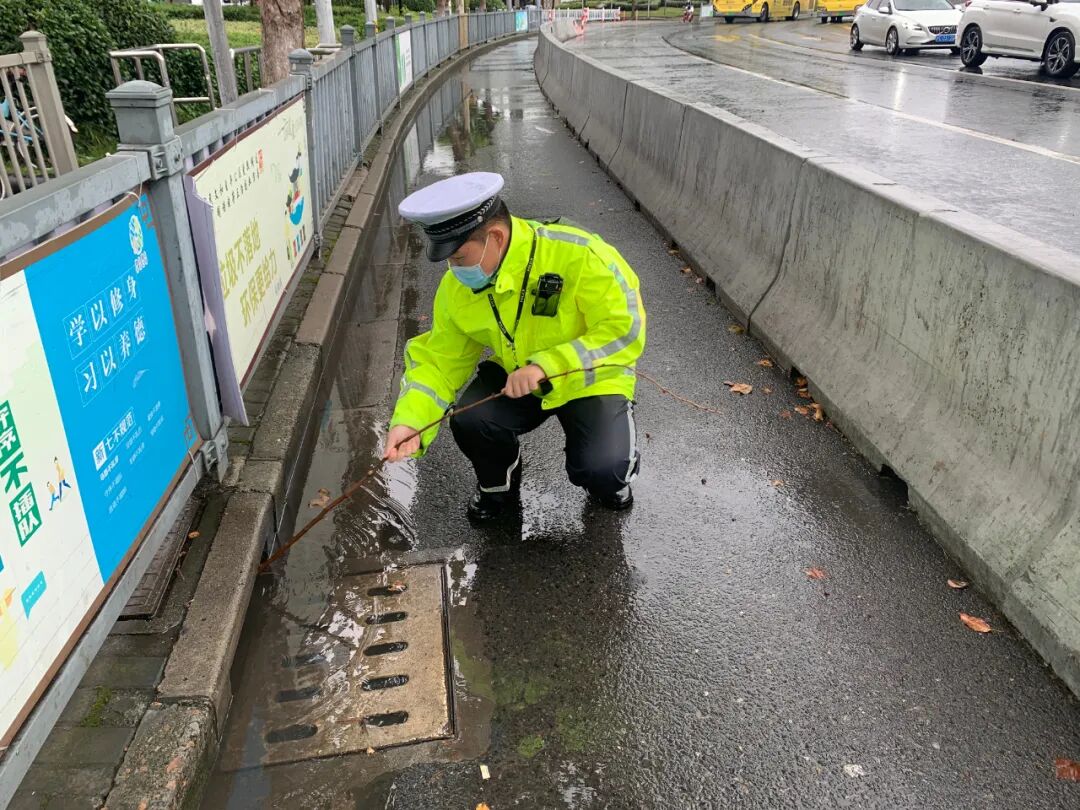 在真南路沪宜公路路口,南翔派出所辅警疏通下水道的树叶,防止路段积水。同时加大警力疏导交通,确保道路畅通。