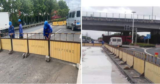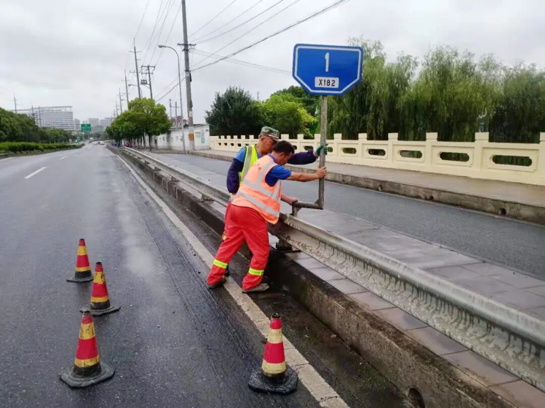 翔达市政对易积水点道路疏通雨水口树叶垃圾,对道路机非车道防台护栏加固,为百米桩牌照进行倾斜修复,养护工人对泵车水管提前自检、自修。