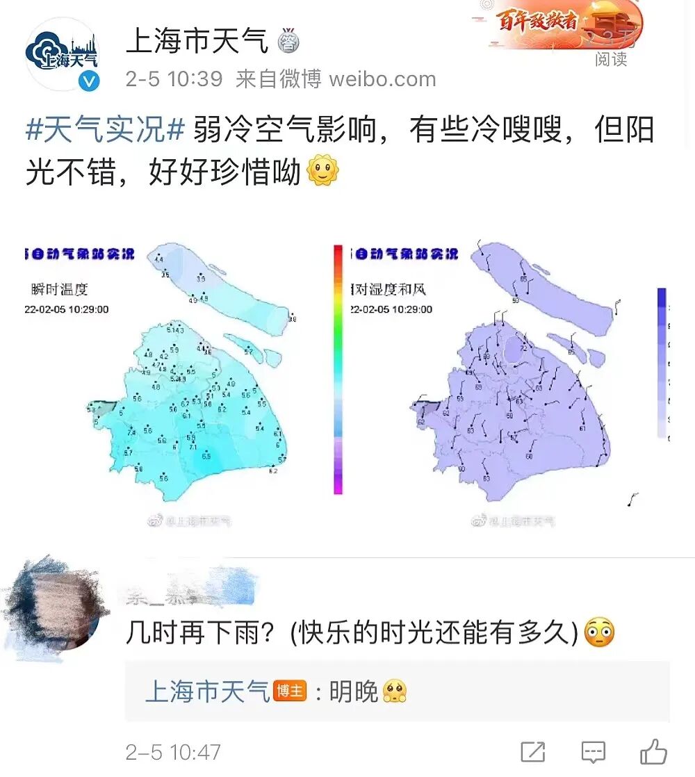 - 2022年的第35天 -嘉定明日天气:阴转小雨 6℃/2℃ 不知不觉,算上今天 春节假期只剩2天了阳光也将与我们暂别明天上海雨雪来袭节后首个工作日降水明显▽…