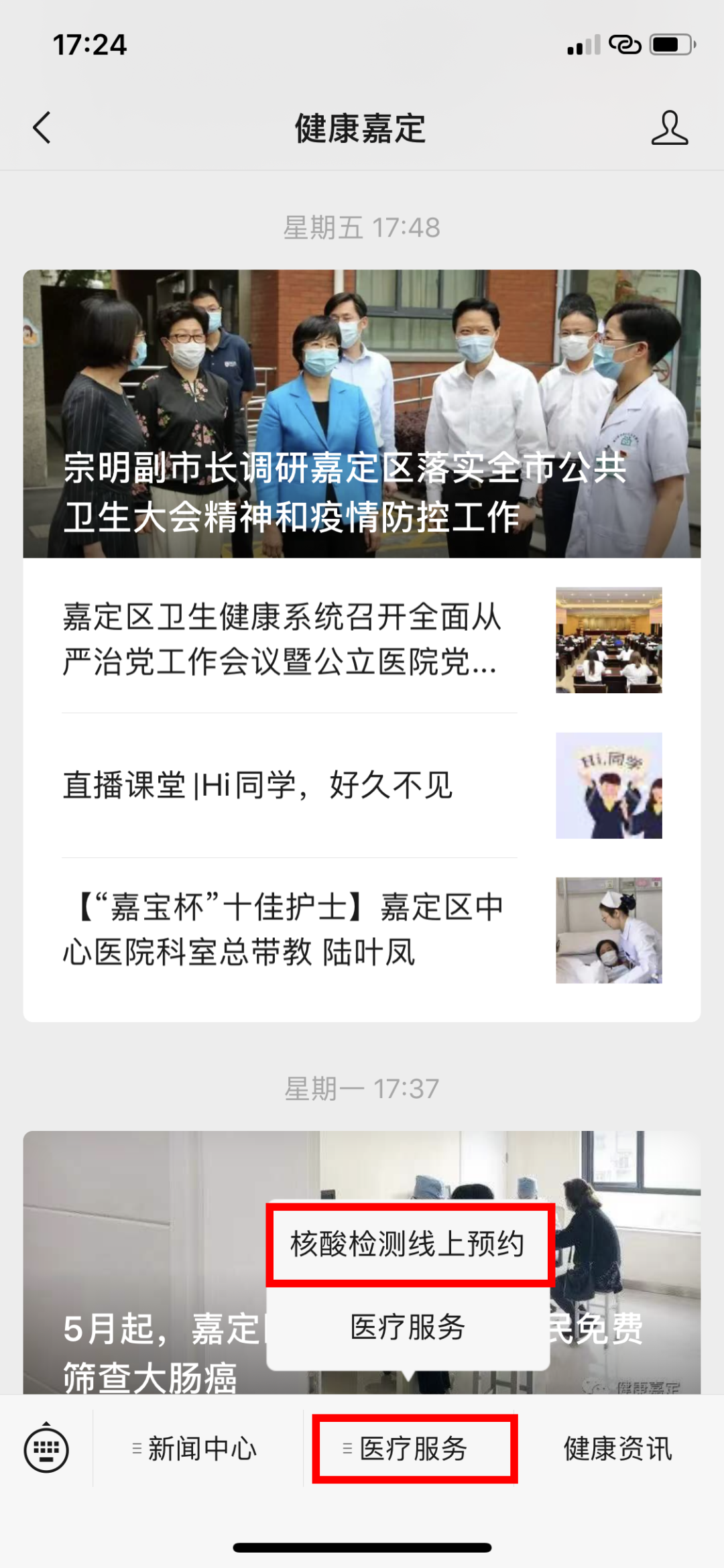 (2)点击【医疗服务】选择【核酸检测线上预约】。