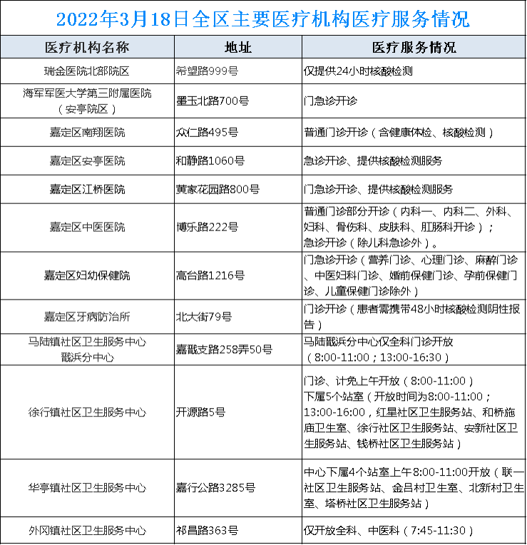 近期,本区多家医疗机构因配合疫情协查工作和防疫要求,暂停部分医疗服务。为方便市民就医问诊,嘉定区卫生健康委整理了近期各单位医疗服务情况,在“健康嘉定”微信公众号上发布,供广大市民参考。  相关医疗机构目前仍处于封控或筛查中,“健康嘉定”根据疫情及时动态调整,请市民朋友也同时关注各医疗机构官方网站和公众号。