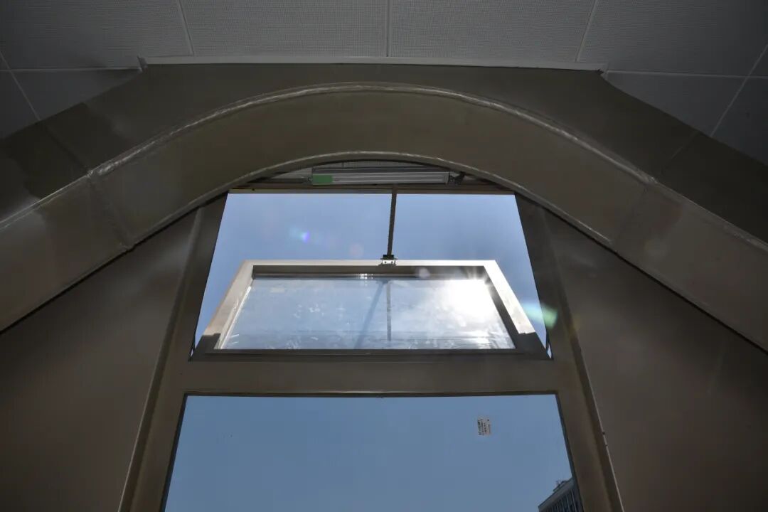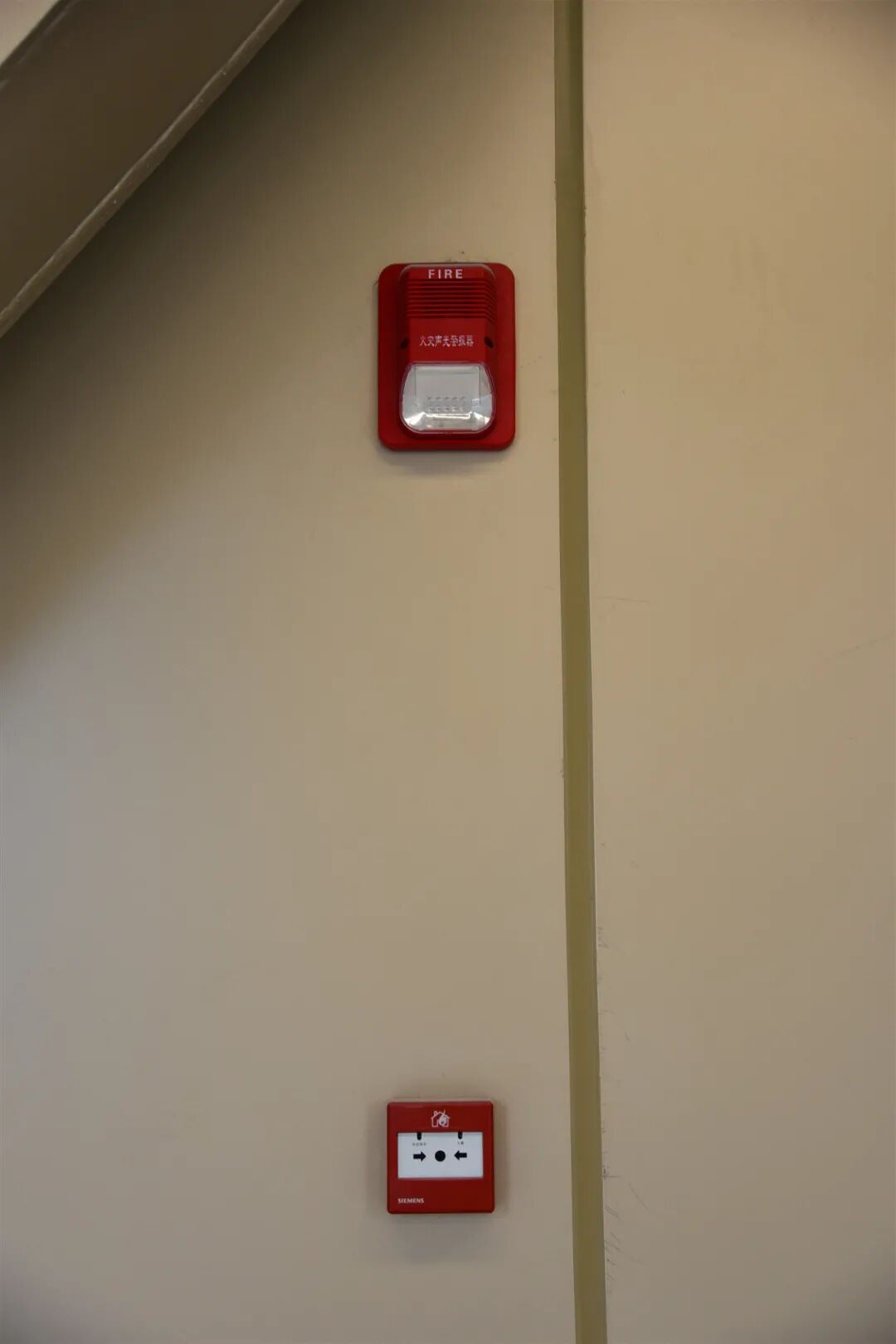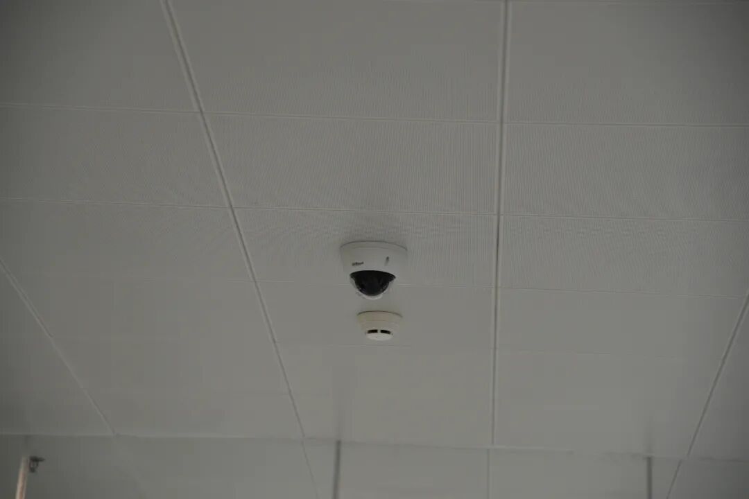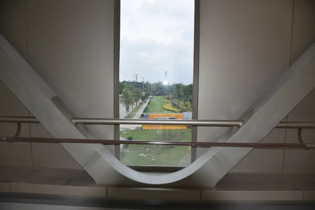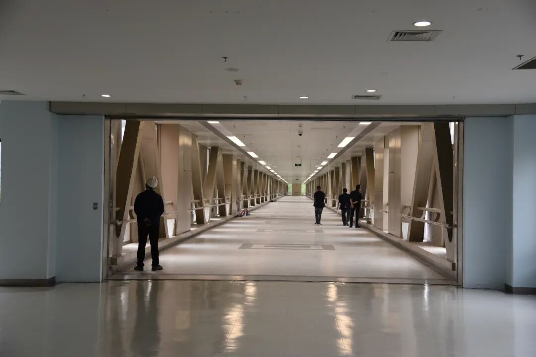 连廊采光优良,两边有多扇落地窗,并安装防护扶手,天花板上,视频摄像头和防火设备已经安装完毕。