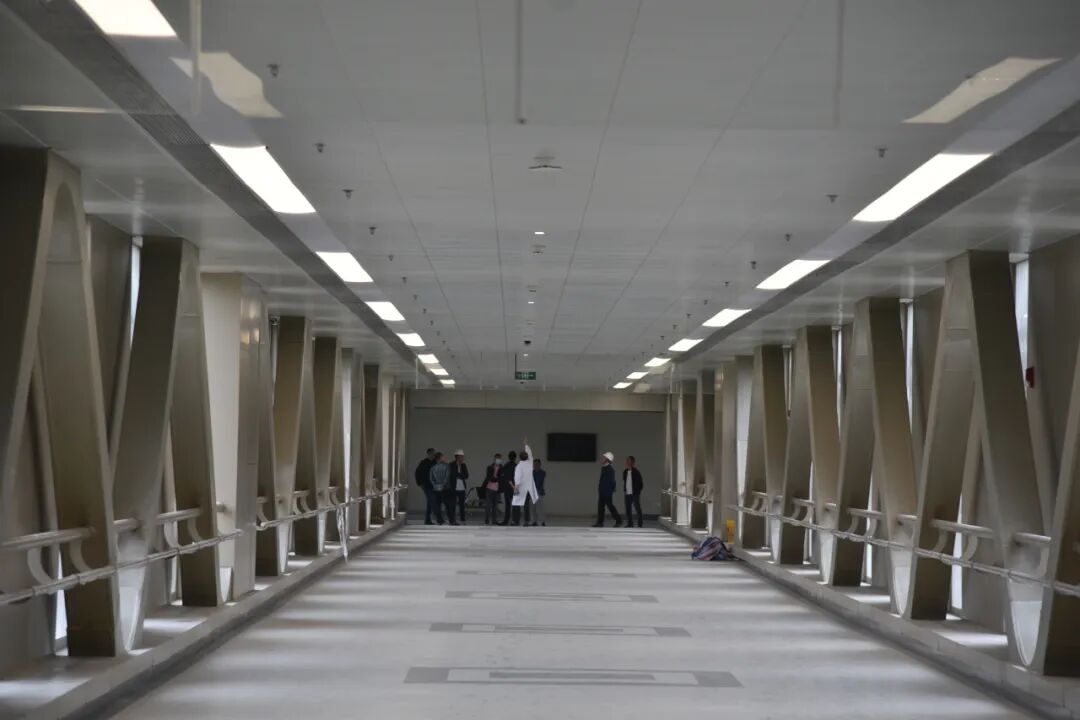 左全祥是双丁路(合作路–永盛路)连廊建设施工方负责人,他介绍道:连廊设计充分考虑了来往医务人员和患者等的便捷性,中间行车,两边走人。连廊也已全部通电,并进入验收阶段,将于5月底左右正式投入使用。