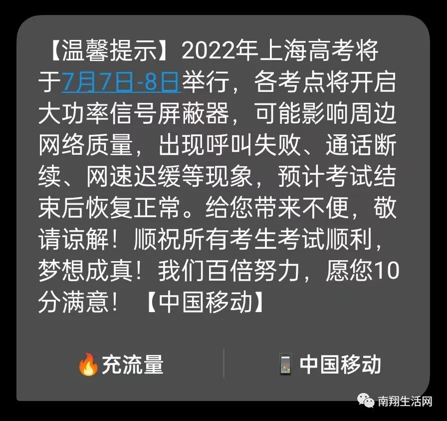 另据中国移动短信通知:7月7日-8日举行,各考点将开启大功率信号屏蔽器,可能影响周边网络质量,出现呼叫失败、通话断续、网速迟缓等现象,预计考试结束后恢复正常。