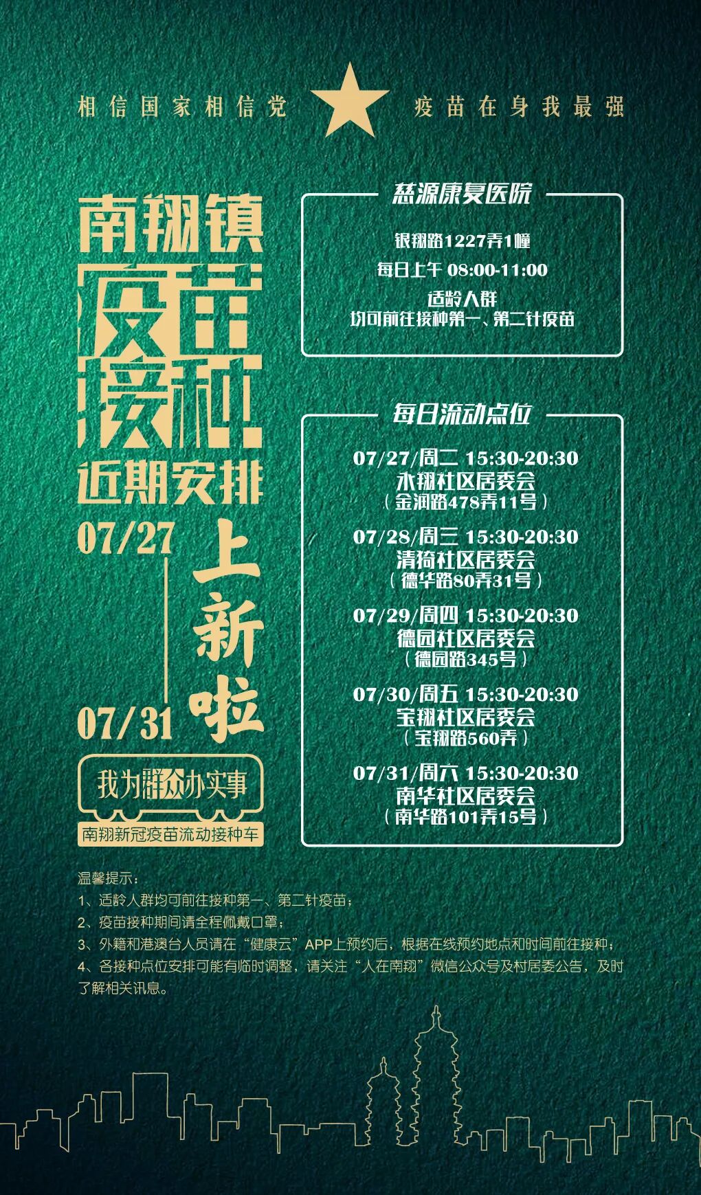 - 2021年的第205天 -嘉定明日天气:小雨转阴 30℃/26℃  自7月27日起 南翔镇各新冠疫苗接种点恢复接种 具体安排如下   接种点一 静华会所 1…
