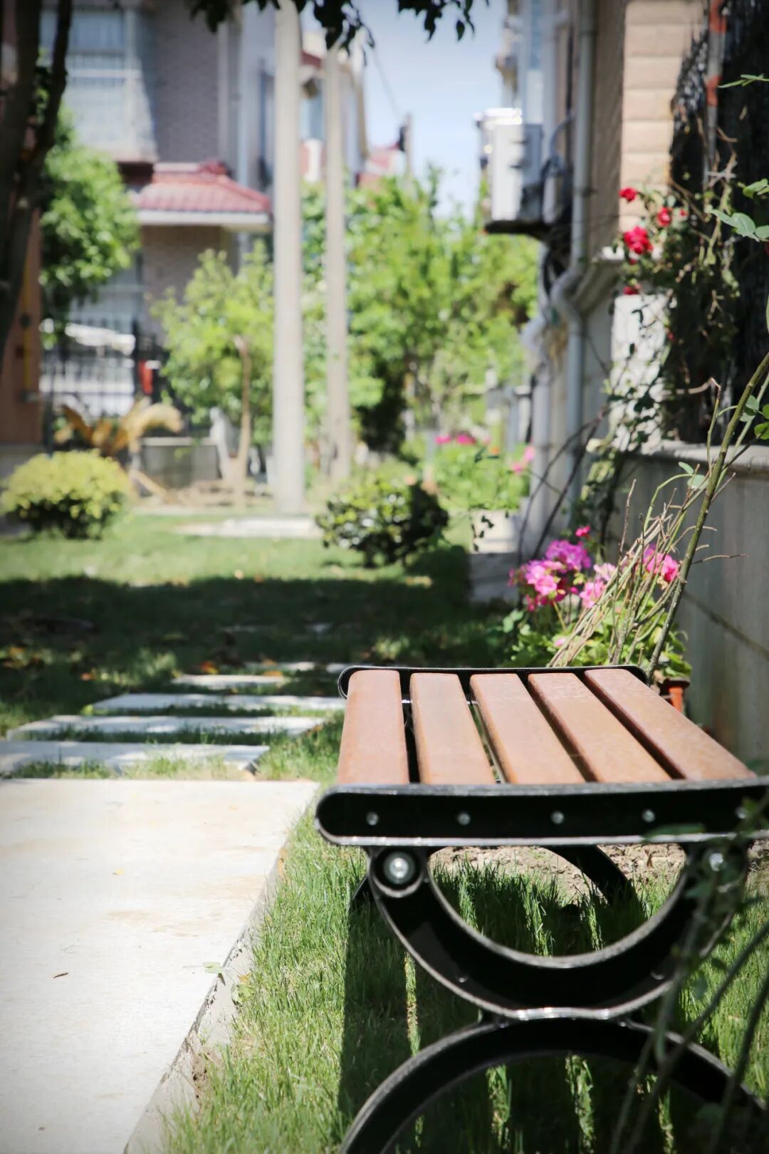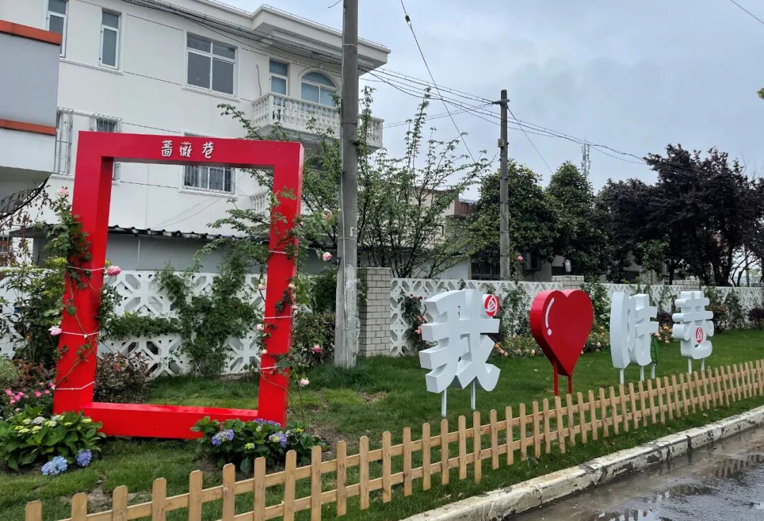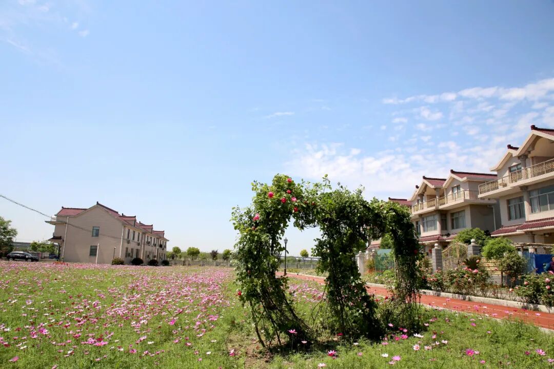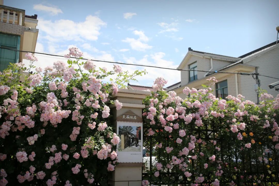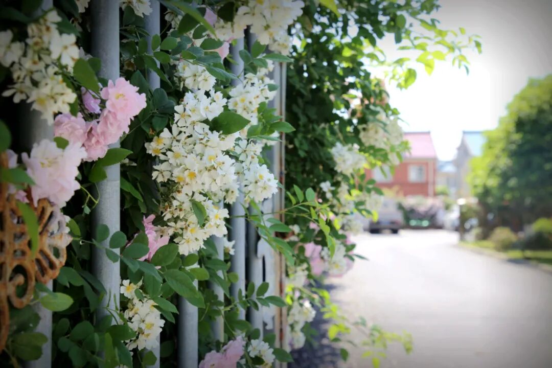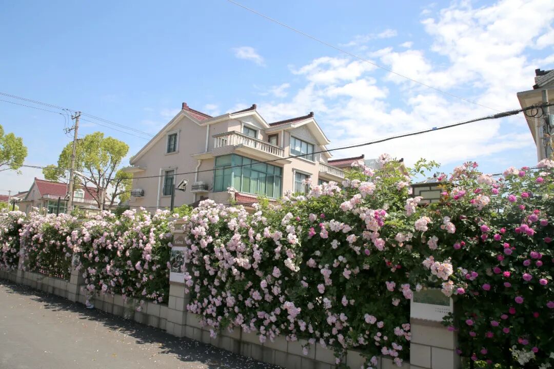 成片成群的蔷薇花簇拥着居民家的院子,
