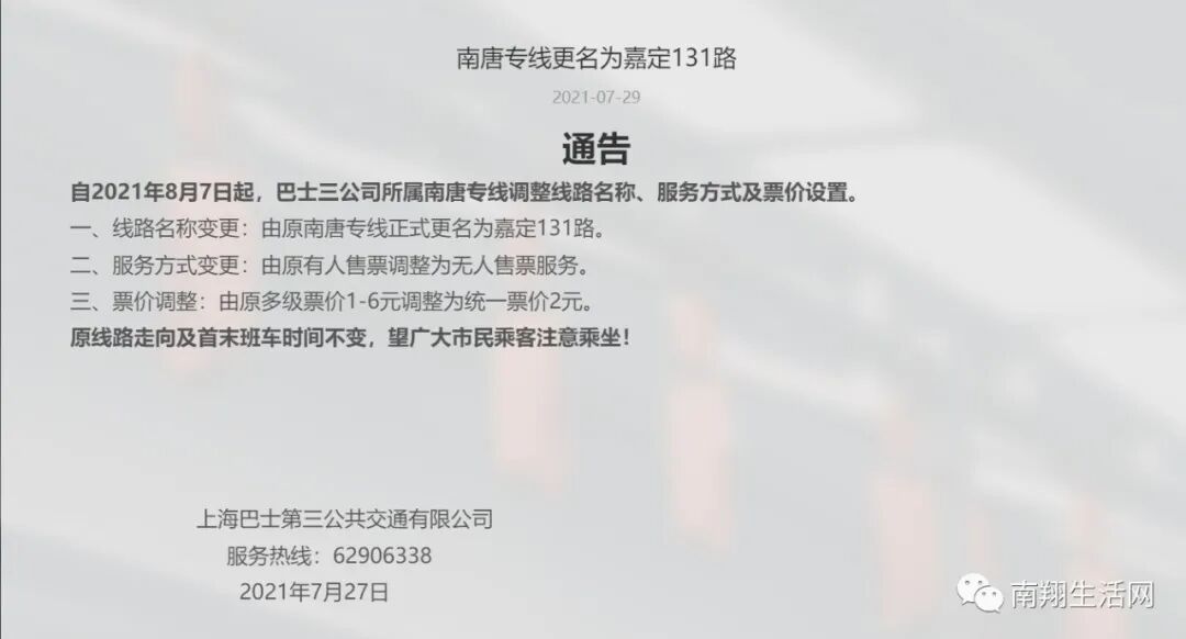 一、线路名称变更:由原南唐专线正式更名为嘉定131路。
