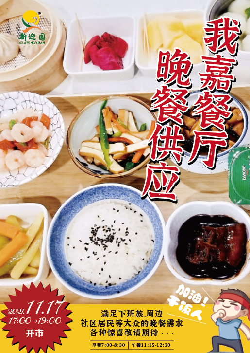 于是,“我嘉餐厅”计划从11月17日起开设晚餐服务,进一步方便市民就餐,丰富菊园新区“15分钟生活圈”内涵。