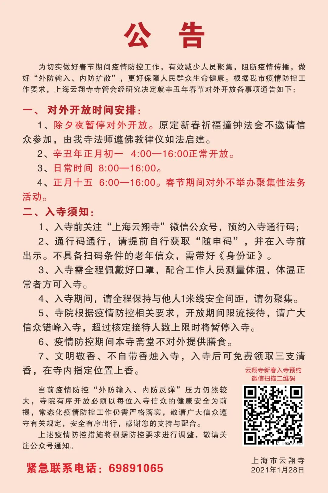 为切实做好春节期间疫情防控工作,有效减少人员聚集,阻断疫情传播,做好“外防输入、内防扩散”,更好保障人民群众生命健康。根据我市疫情防控工作要求,上海云翔寺寺管会经研究决定就辛丑年春节对外开放各事项通告如下: