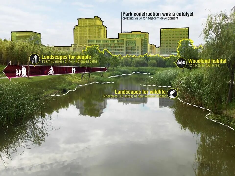 “这座70公顷的线性公园整合了丰富的湿地、林地、休闲开放和静谧的空间,不仅能够恢复生物多样性、改善水质,还是周边TOD为导向的社区‘城市绿肺’,连接分散的绿地斑块。”