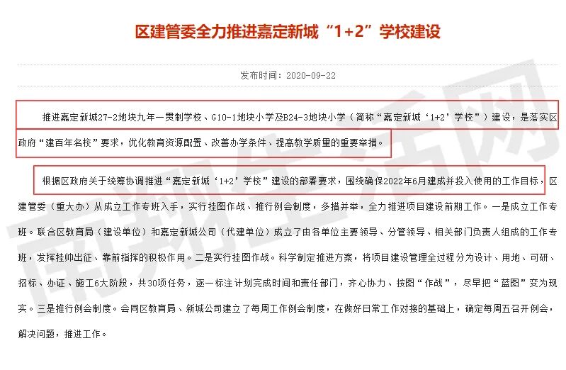 据嘉定区建设和管理委员会2020年9月22日发布的消息,推进嘉定新城27-2地块九年一贯制学校、G10-1地块小学及B24-3地块小学(简称“嘉定新城‘1+2’学校”)建设,是落实区政府“建百年名校”要求,优化教育资源配置、改善办学条件、提高教学质量的重要举措。