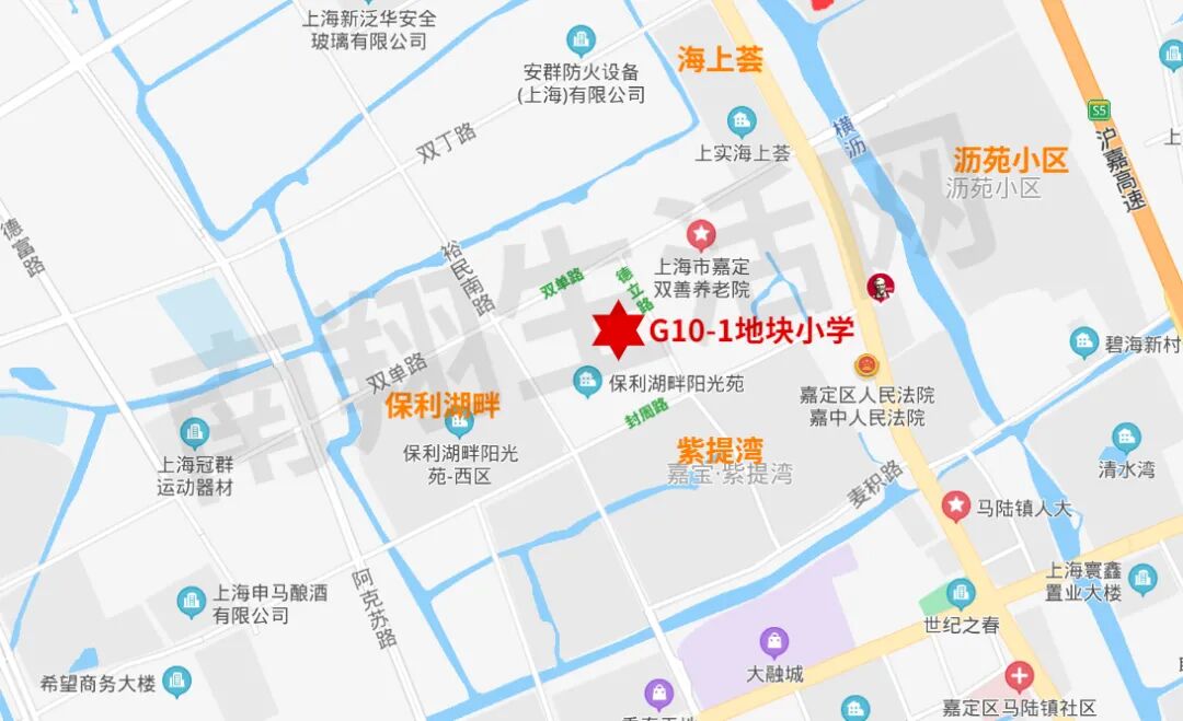 嘉定新城G10-1地块小学新建工程的建设项目地址:双单路与德立路交叉口西南角。基地北侧为双单路,南侧为封周路,西侧为保利湖畔阳光苑住宅小区,东侧为德立路。