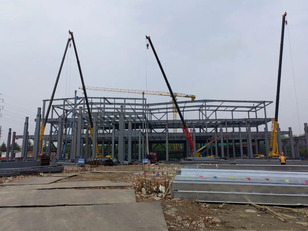 7月18日下午,在安亭镇众百路448号的施工现场,塔吊林立,工人们正在紧张作业,钢结构吊装、汽车坡道施工等工作在有条不紊地进行。