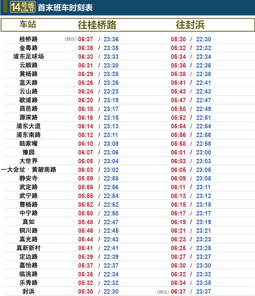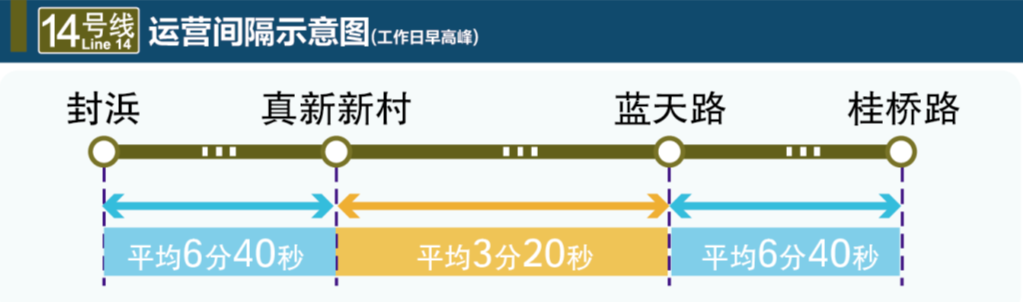 根据运行计划安排,14号线开通初期运营后,全天开行“封浜站至桂桥路站”的大交路,和“真新新村站至蓝天路站”的小交路。