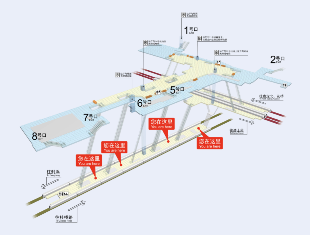 如上图,小编为大家准备了一份真如站的站层图,如果需要去静安寺、豫园等方向的11号线乘客,可以直接换乘14号线。特别需要注意的是,如果是14号线换乘前往嘉定北方向,则需要前往上,经过站厅层下楼再换乘。